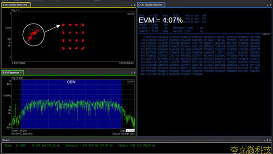 您可以看到以144 GHz为中心的信号,大约有10 GHz的占用带宽。16 QAM星座出现在左上方。如果放大其中一个星座状态(用白色圆圈圈出),由于LO相位噪声,您会看到一些最小的色散。星座图状态的最小色散对应于右侧摘要中显示的1.56%EVM。