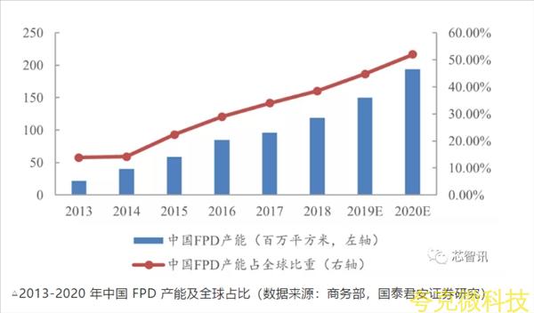 据商务部数据显示,2013 年国内 FPD 产能仅为 22 百万平方米,而 2017 年国内产能迅速增长到 96 百万平方米,预计 2020 年我国 FPD产能将达到 194 百万平方米,2013-2020 年复合增长率达 36.48%,FPD市场保持高速增长,发展空间巨大。