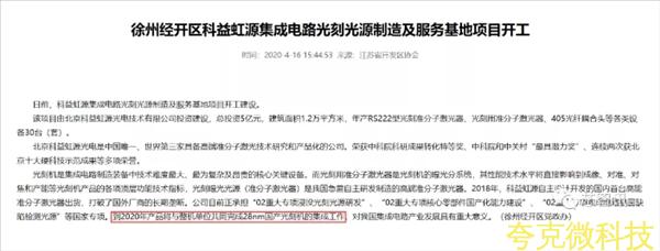 芯智讯通过查询相关资料也发现,徐州经开区官网于今年4月16日发布的一则题为《徐州经开区科益虹源集成电路光刻制造及服务基地项目开工》的文章当中有提及,科益虹源目前正承担“02重大专项浸没光刻光源研发”、“02重大专项核心零部件国产化能力建设”、“02重大专项集成电路晶圆缺陷检测光源”等国家专项。