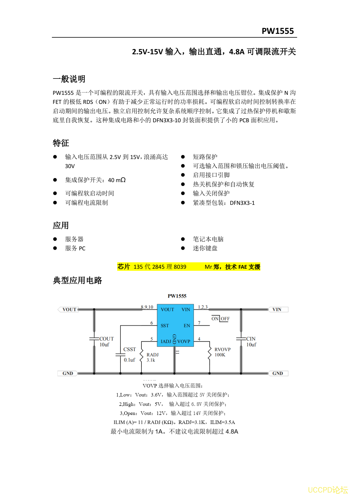 过压过流保护芯片,PW1555规格书,4.8A可调限流