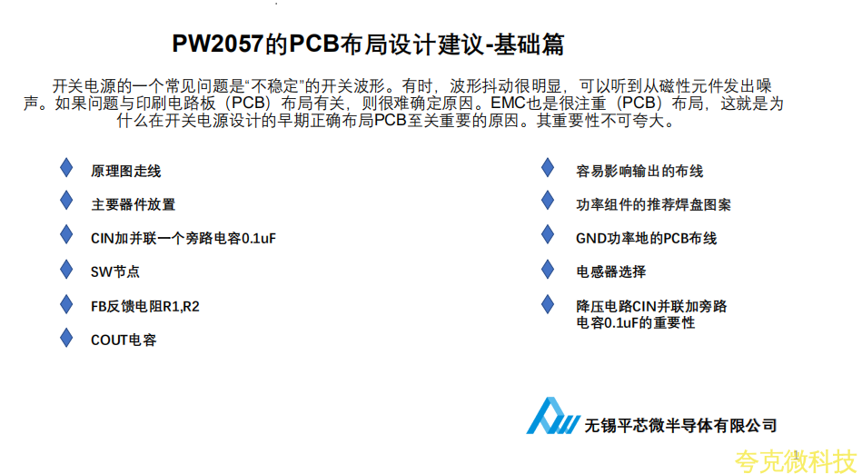 PW2057是一个恒频、恒压模式降压转换器。该器件集成了一个主开关和一个同步整流器,无需外加肖特基二极管就可以实