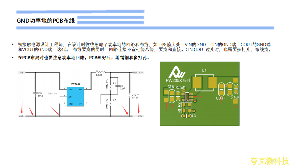 初接触电源设计工程师,在设计时往往忽略了功率地的回路和布线,如下图箭头处,VIN的GND,CIN的GND端,COUT的GND端和VOUT的GND端,这4点,布线要宽的同时,回路连接不宜七绕八绕,要宽和直接。CIN,COUT过孔时,也需要多打孔,布线宽。