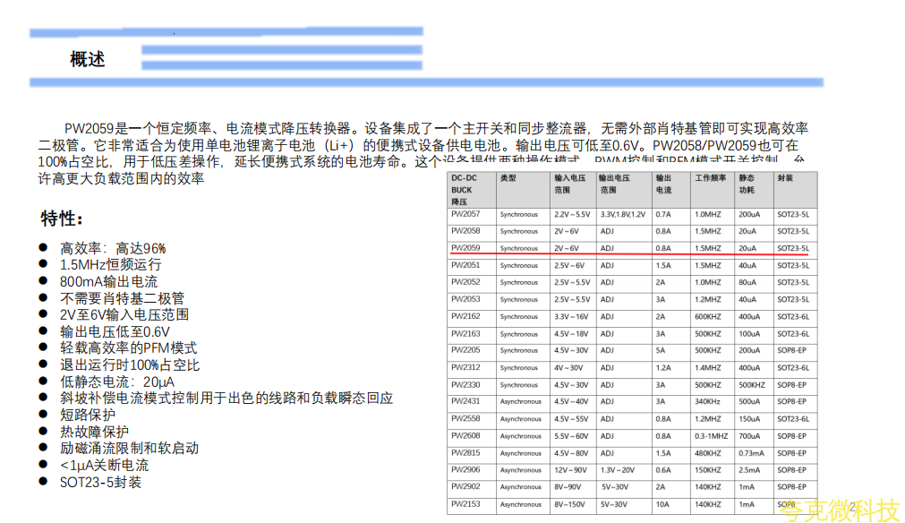 PW2059是一个恒定频率、电流模式降压转换器。设备集成了一个主开关和同步整流器,无需外部肖特基管即可实现高效率二极管。它非常适合为使用单电池锂离子电池(Li+)的便携式设备供电电池。输出电压可低至0.6V。PW2058/PW2059也可在100%占空比,用于低压差操作,延长便携式系统的电池寿命。这个设备提供两种操作模式,PWM控制和PFM模式开关控制,允许高更大负载范围内的效率。