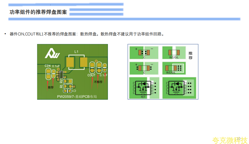 • 开关电源电路可以分为功率级电路和小信号控制电路。功率级电路包括传导大电流的组件。通常,应首先放置这些组件(PW2059芯片,L1,CIN和COUT)。随后将小信号控制电路FB放置在布局中的特定位置。电感大电流走线应短而宽,以最小化PCB电感,电阻和电压降。
