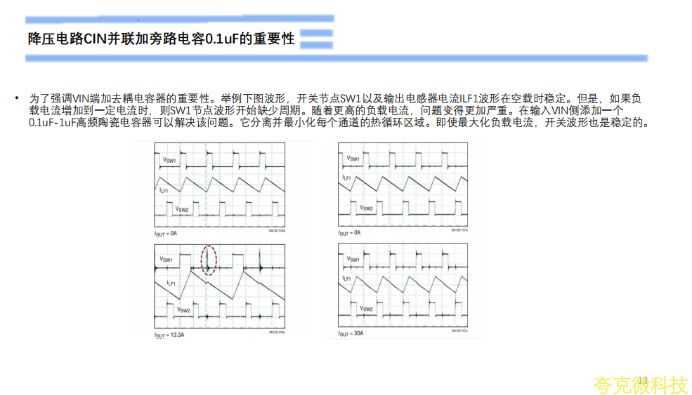 为了强调VIN端加去耦电容器的重要性。举例下图波形,开关节点SW1以及输出电感器电流ILF1波形在空载时稳定。