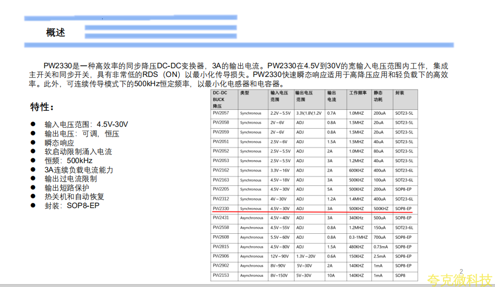 PW2330是一种高效率的同步降压DC-DC变换器,3A的输出电流。PW2330在4.5V到30V的宽输入电压范围内工作,集成主开关和同步开关,具有非常低的RDS(ON)以最小化传导损失。PW2330快速瞬态响应适用于高降压应用和轻负载下的高效率。此外,可连续传导模式下的500kHz恒定频率,以最小化电感器和电容器。