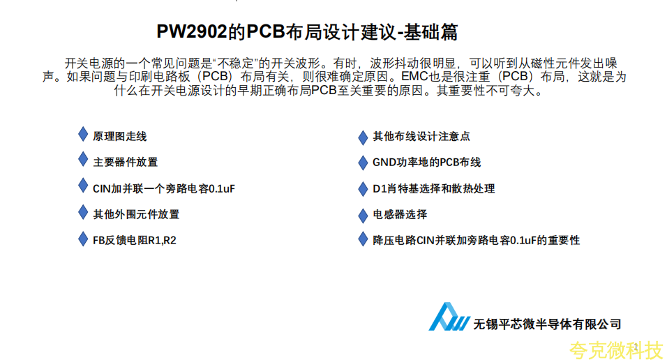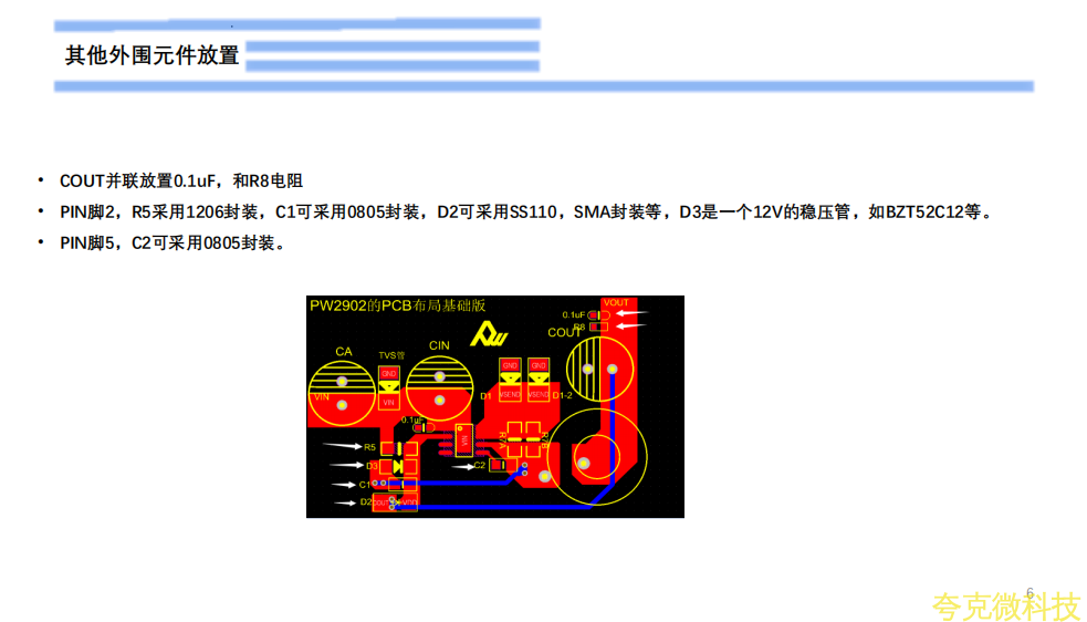 开关电源电路可以分为功率级电路和小信号控制电路。功率级电路包括传导大电流的组件。通常,应首先放置这些组件(PW2902芯片,Q1,D1,R7A,R7B,L1,CIN和COUT)。随后将小信号控制电路放置在布局中的特定位置。电感大电流走线应短而宽,以最小化PCB电感,电阻和电压降。