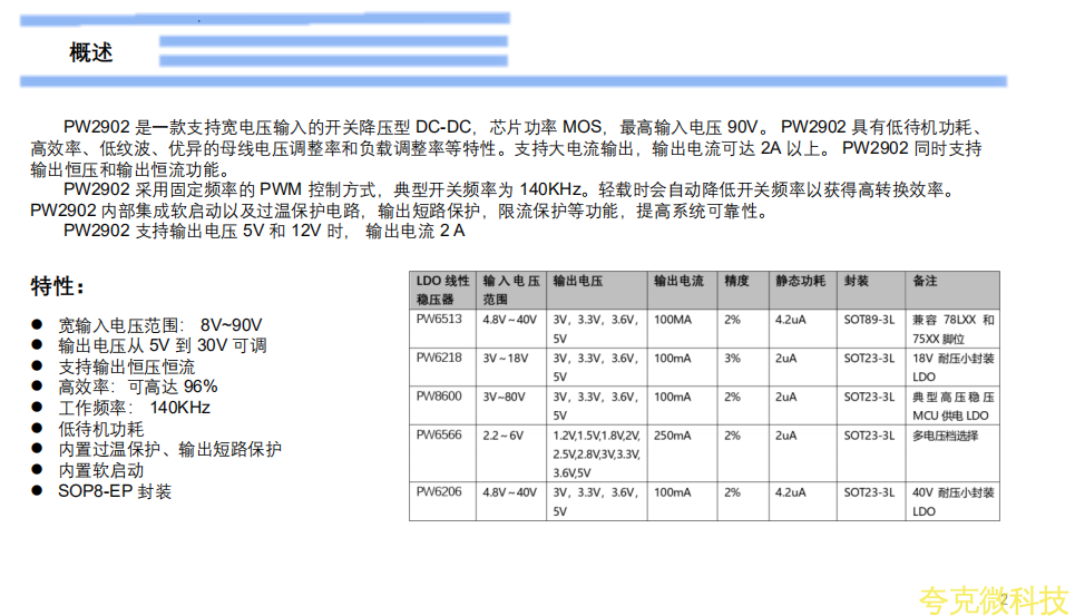 PW2902 是一款支持宽电压输入的开关降压型 DC-DC,芯片功率 MOS,最高输入电压 90V。 PW2902 具有低待机功耗、高效率、低纹波、优异的母线电压调整率和负载调整率等特性。支持大电流输出,输出电流可达 2A 以上。 PW2902 同时支持输出恒压和输出恒流功能。