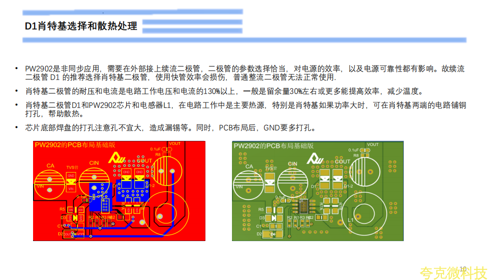 PW2902是非同步应用,需要在外部接上续流二极管,二极管的参数选择恰当,对电源的效率,以及电源可靠性都有影响。故续流二极管 D1 的推荐选择肖特基二极管,使用快管效率会损伤,普通整流二极管无法正常使用.