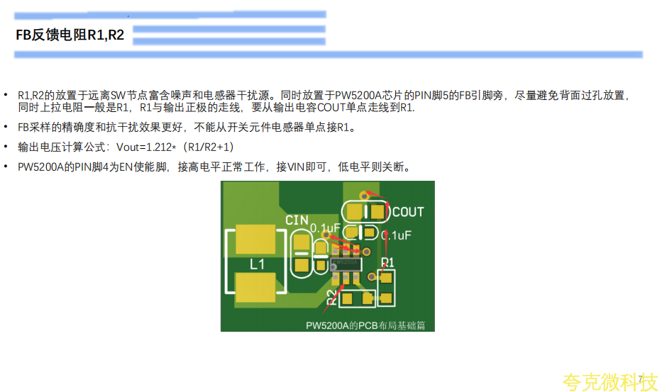 R1,R2的放置于远离SW节点富含噪声和电感器干扰源。同时放置于PW5200A芯片的PIN脚5的FB引脚旁,尽量避免背面过孔放置,同时上拉电阻一般是R1,R1与输出正极的走线,要从输出电容COUT单点走线到R1.