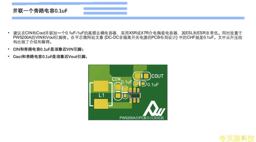 建议在CIN和Cout并联加一个0.1uF-1uF的高频去耦电容器,采用X5R或X7R介电陶瓷电容器,其ESL和ESR非常低。同时放置于PW5200A的VIN和Vout引脚旁。在平芯微网站文章 {DC-DC非隔离开关电源的PCB布局设计} 中的CHF就是0.1uF。文中从升压结构出做了介绍和解释。