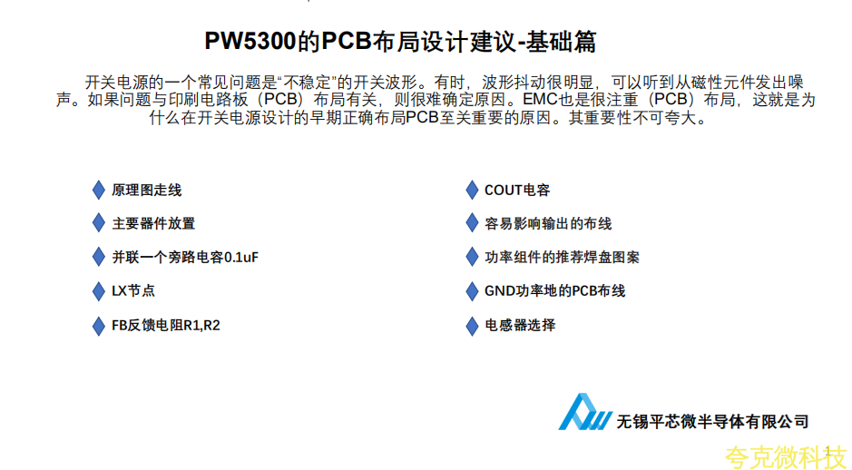 R1,R2的放置于远离LX节点富含噪声和电感器干扰源。同时放置于PW5300芯片的PIN脚5的FB引脚旁,尽量避免背面过孔放置,同时上拉电阻一般是R1,R1与输出正极的走线,要从输出电容COUT单点走线到R1.