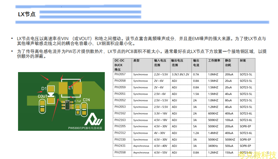 LX节点电压以高速率在VIN (或VOUT)和地之间摆动。该节点富含高频噪声成分,并且是EMI噪声的强大来源。为了使LX节点与其他噪声敏感走线之间的耦合电容最小,LX铜面积应最小化。