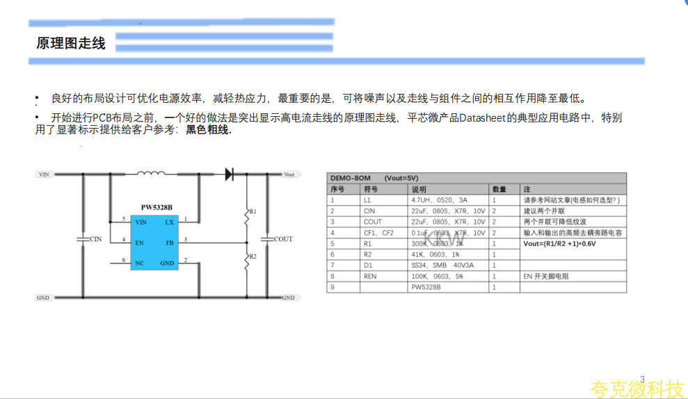 R1,R2的放置于远离LX节点富含噪声和电感器干扰源。同时放置于PW5328B芯片的PIN脚5的FB引脚旁,尽量避免背面过孔放置,同时上拉电阻一般是R1,R1与输出正极的走线,要从输出电容COUT单点走线到R1.