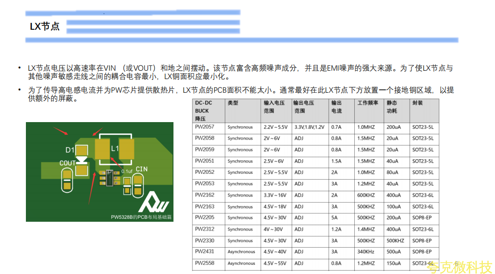 LX节点电压以高速率在VIN (或VOUT)和地之间摆动。该节点富含高频噪声成分,并且是EMI噪声的强大来源。为了使LX节点与其他噪声敏感走线之间的耦合电容最小,LX铜面积应最小化。