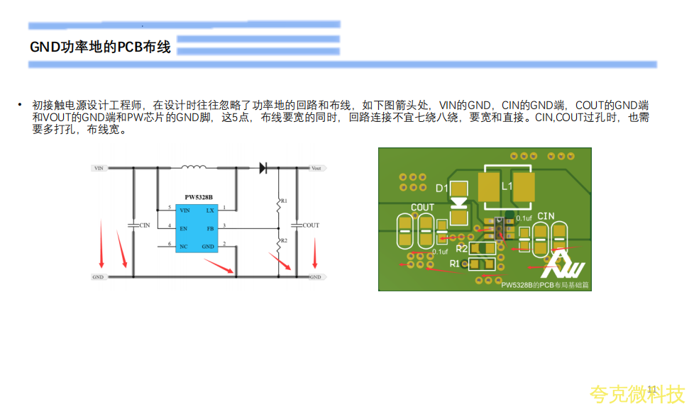 初接触电源设计工程师,在设计时往往忽略了功率地的回路和布线,如下图箭头处,VIN的GND,CIN的GND端,COUT的GND端和VOUT的GND端和PW芯片的GND脚,这5点,布线要宽的同时,回路连接不宜七绕八绕,要宽和直接。CIN,COUT过孔时,也需要多打孔,布线宽。