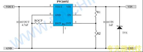 PW2605Z 本质上是一个由逻辑信号控制的智能电子开关。它内部集成了一颗低导通电阻的功率MOSFET,当开启时,输出电压近似等于输入电压减去MOSFET上的微小压降。其设计远不止于此,围绕此开关构建的多重保护机制是其核心价值所在:
