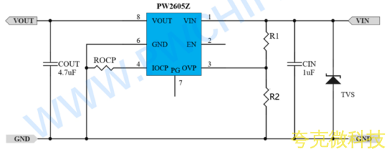 PW2605Z:同时集成可编程OVP(4.5V-16V) 和可编程过流保护(OCP,0.5A-3A),并提供了一个PG(电源良好) 状态输出引脚,可直接驱动指示灯或通知主控。