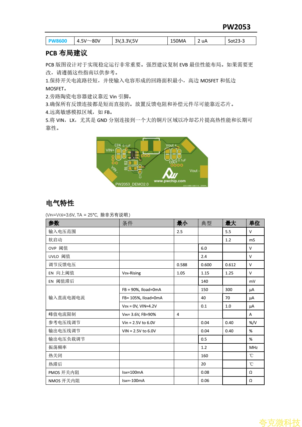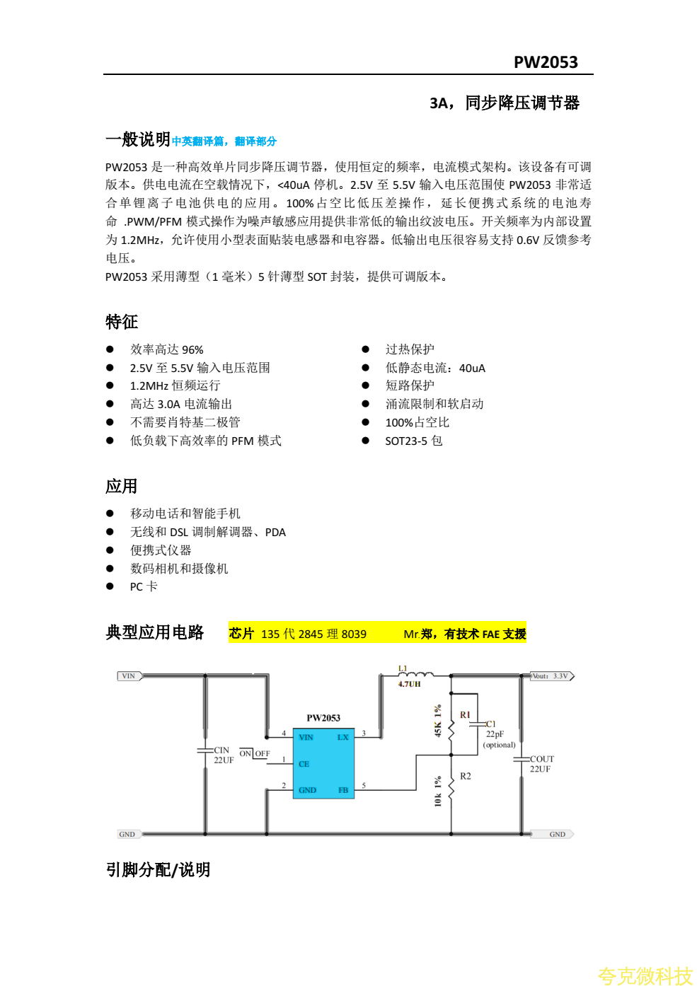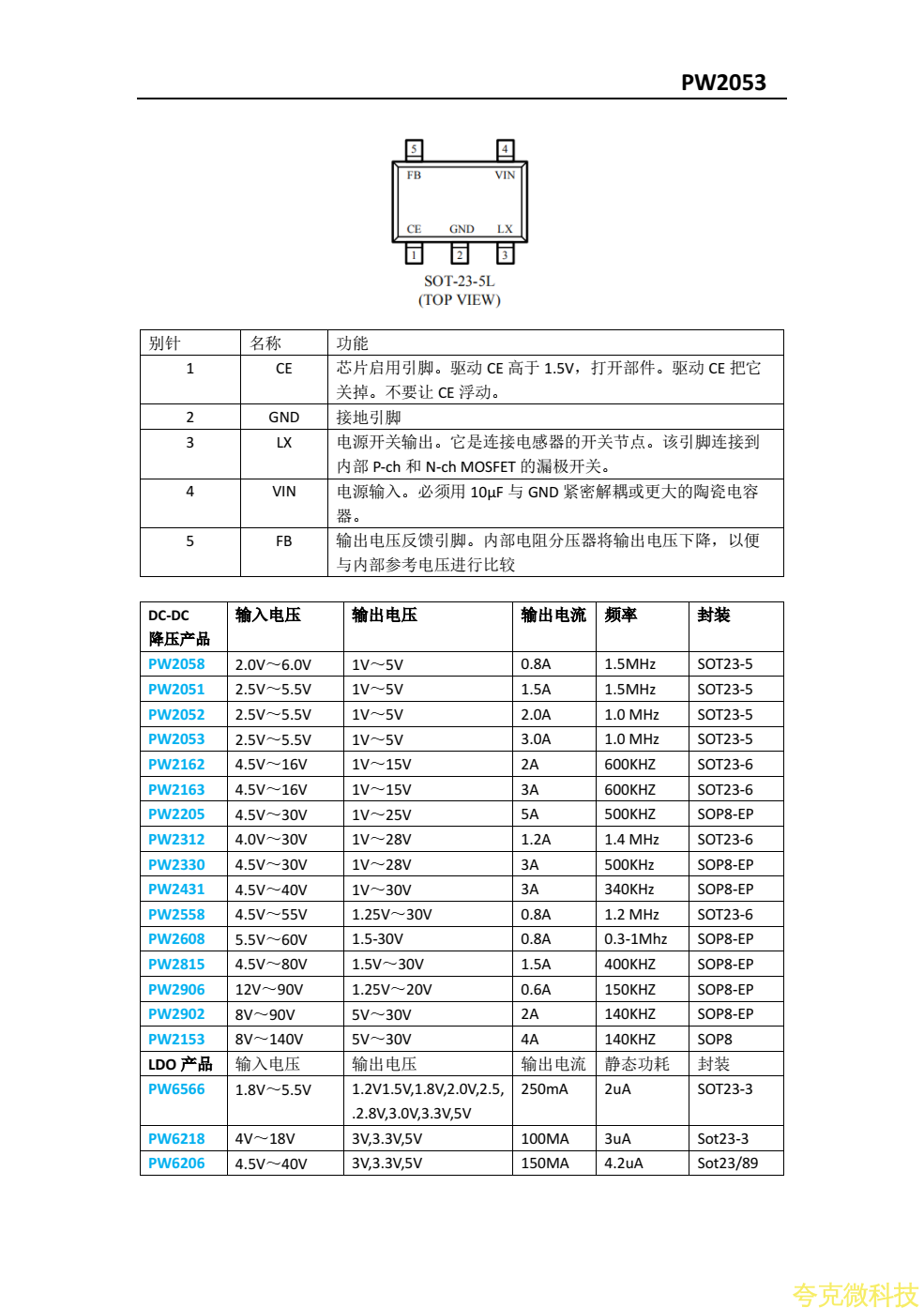 PW2053 是一种高效单片同步降压调节器,使用恒定的频率,电流模式架构。该设备有可调版本。供电电流在空载情况下, <40uA 停机。 2.5V 至 5.5V 输入电压范围使 PW2053 非常适合单锂离子电池供电的应用。 100%占空比低压差操作,延长便携式系统的电池寿命 .PWM/PFM 模式操作为噪声敏感应用提供非常低的输出纹波电压。开关频率为内部设置为 1.2MHz,允许使用小型表面贴装电感器和电容器。低输出电压很容易支持 0.6V 反馈参考电压。