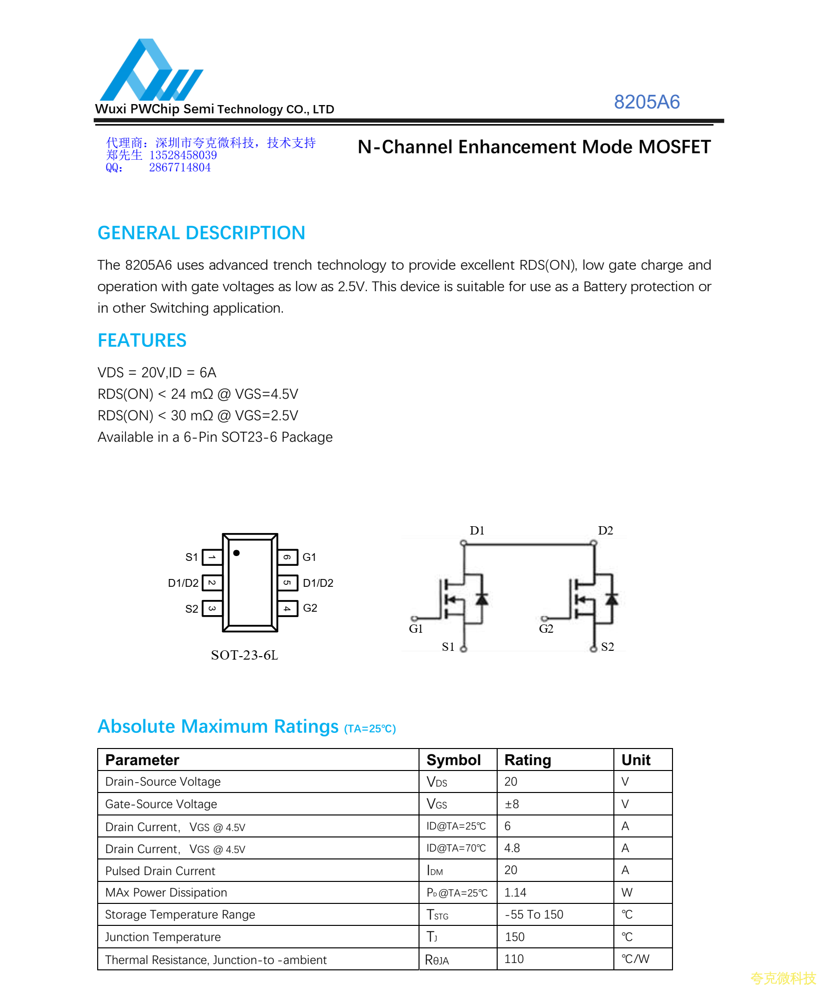 8205A6的基本参数:VDS = 20V,ID = 6A , RDS(ON) < 24 mΩ @