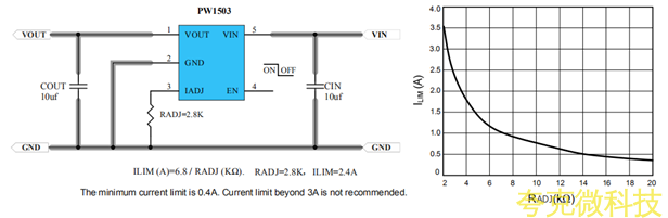 PW1503是超低 RDS( ON)开关,具有可编程的电流限制,以保护电源源于过电流和短路保护。它具有超温保护以及反向闭锁功能。