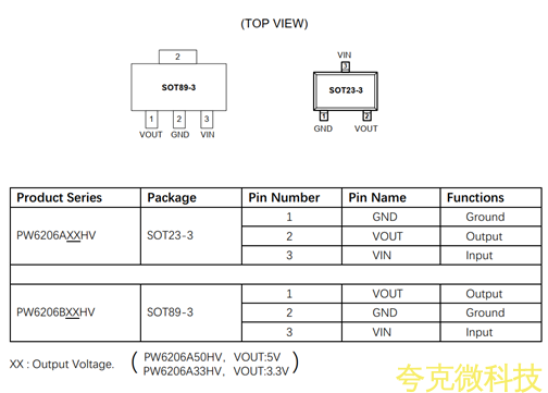 PW6206调节器有标准 SOT89-3L和 SOT23-3L封装。标准产品无铅无卤。