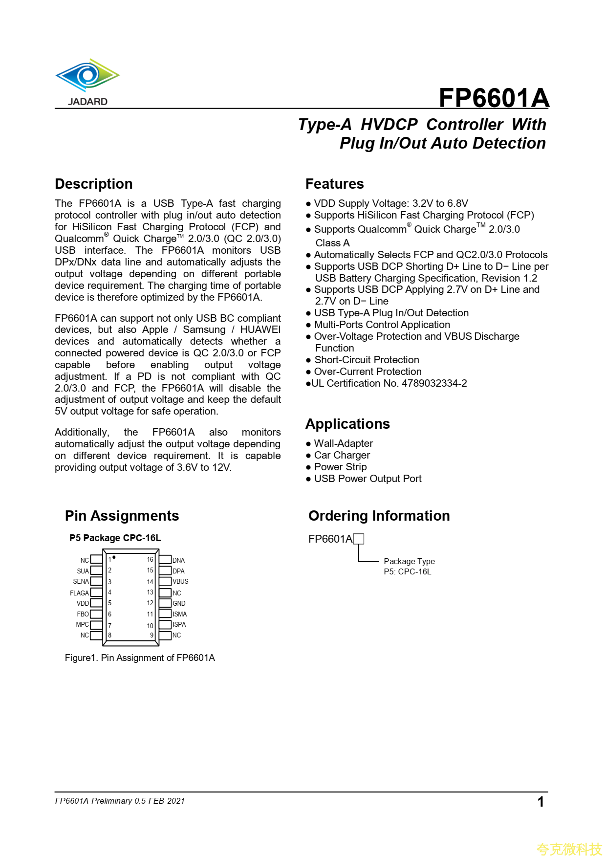代理天钰 FP6601AAP6 Type-A HVDCP控制器和插入/输出自动检测