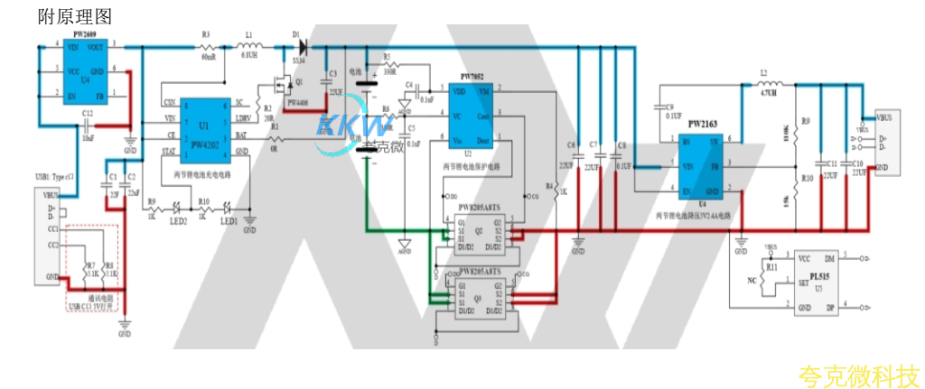 1、 锂电池充电电路芯片: PW4202, 可支持 3A 的充电电流, 可外接 MOS 管, 支持 5V 输入