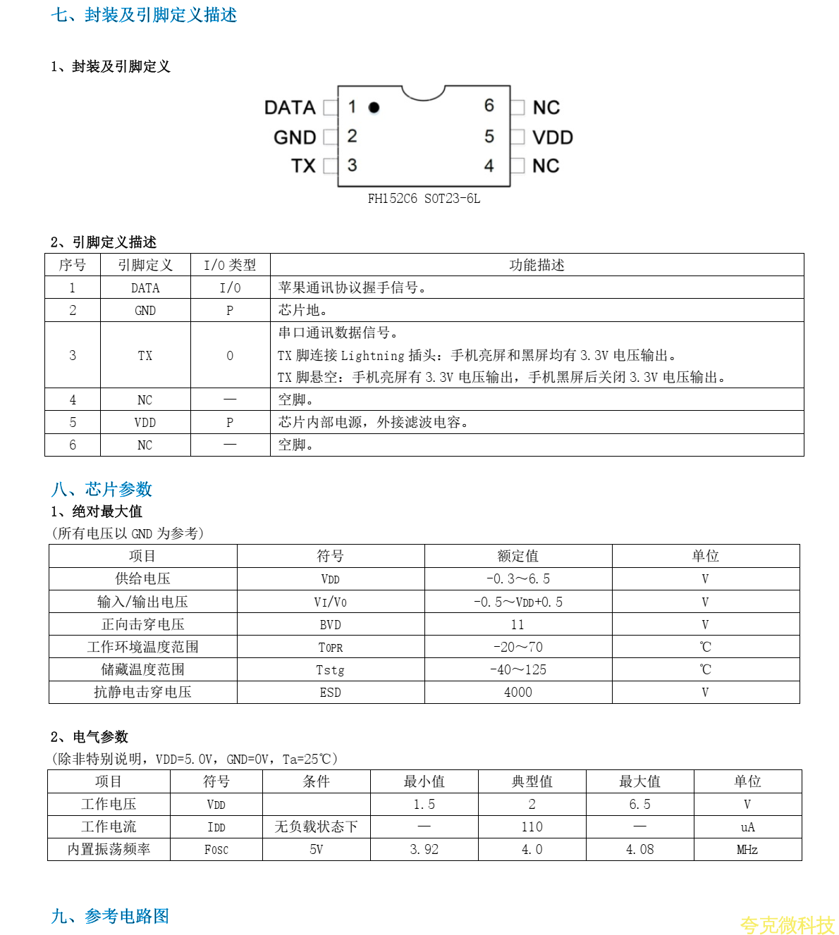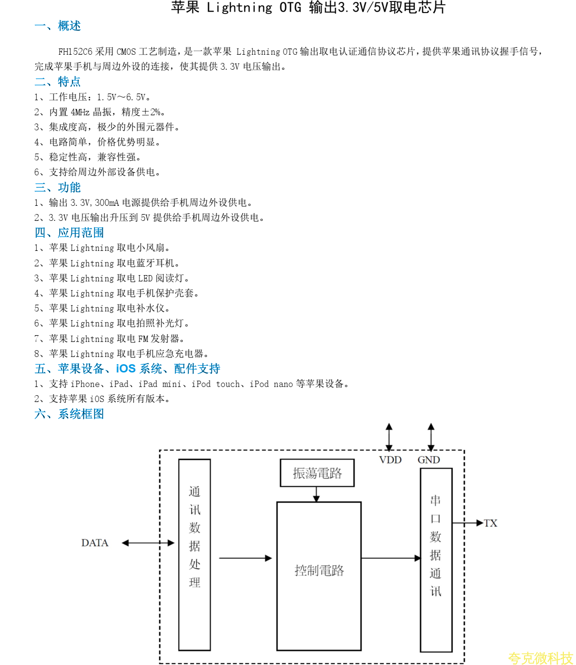 FH152C6 采用 CMOS 工艺制造, 是一款苹果 Lightning OTG 输出取电认证通信协议芯片,提供苹果通讯协议握手信号,