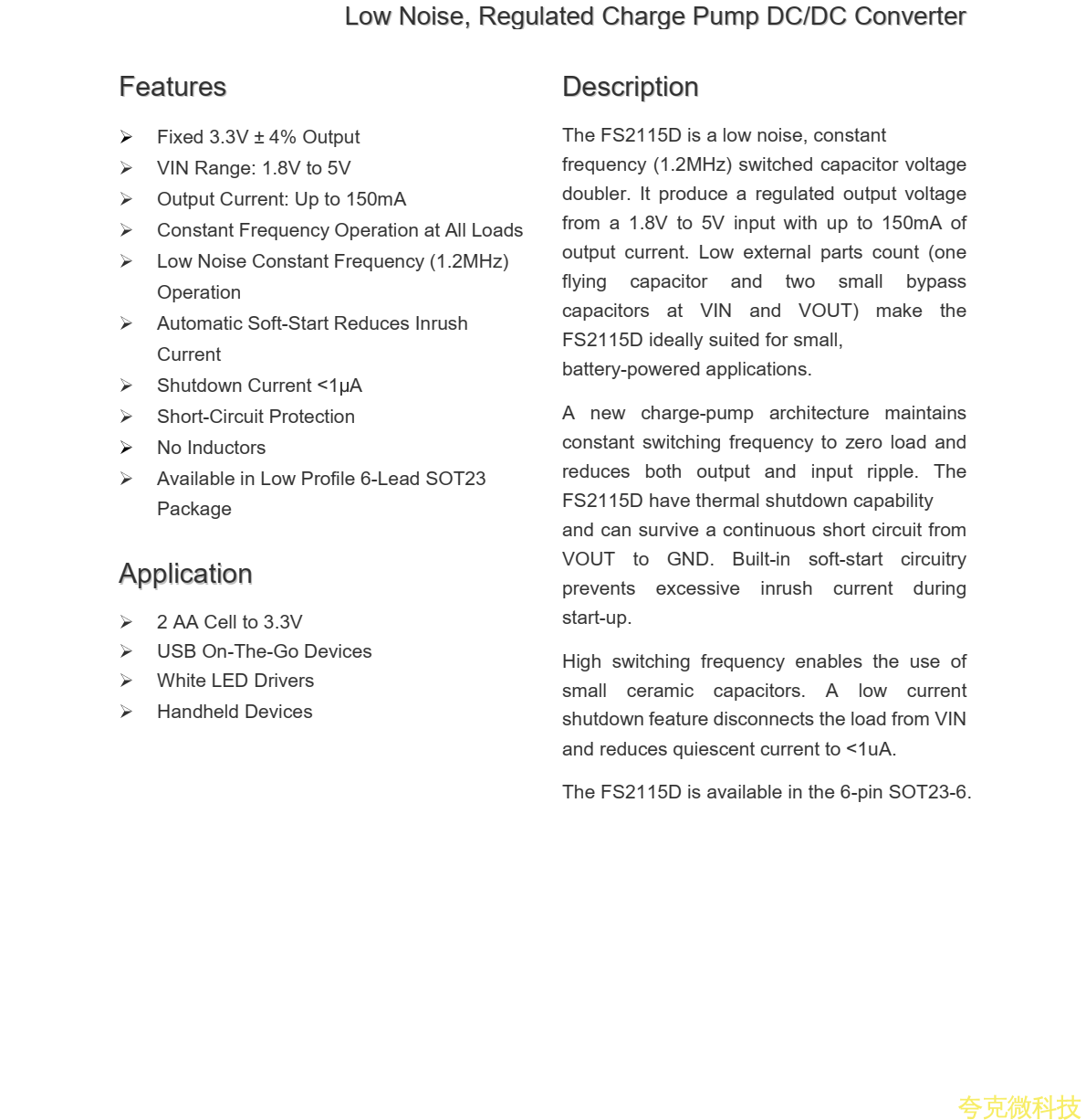 FS2115D是一款低噪声、恒定 频率(1.2MHz)开关电容器电压 倍增器