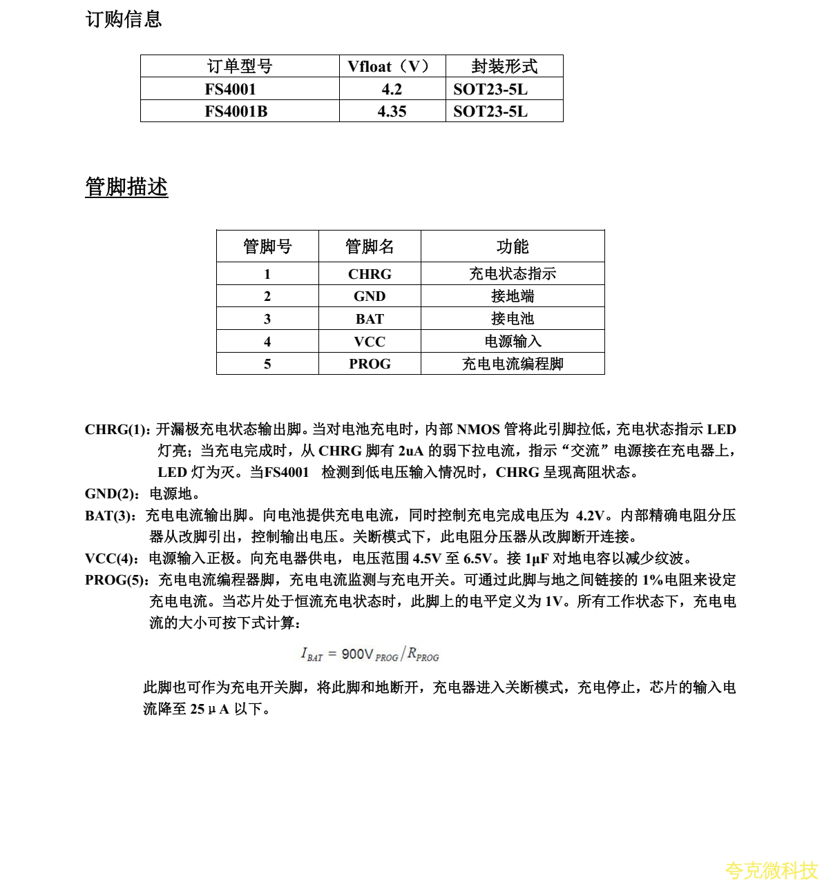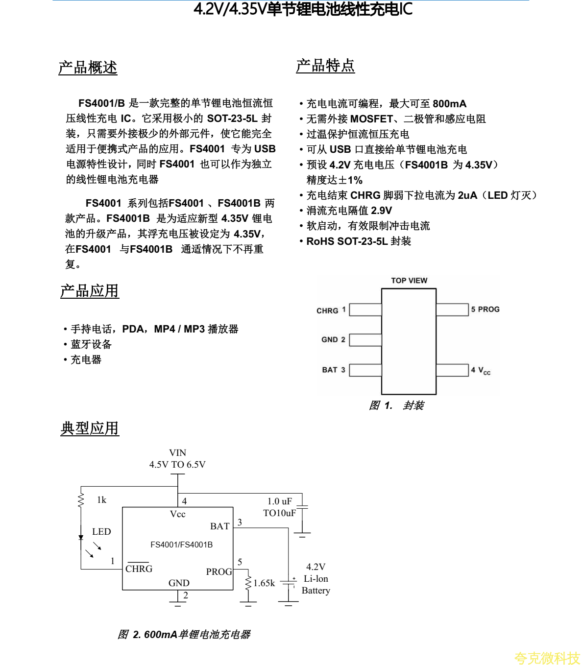 FS4001 系列包括FS4001 、 FS4001B款产品。 FS4001B 是为适应新型 4.35V 锂池的升级产品,其浮充电压被设定为 4.35V,在FS4001 与FS4001B 通适情况下不再重复。FS4001/B 是一款完整的单节锂电池恒流压线性充电 IC。它采用极小的 SOT-23-5L 封装, 只需要外接极少的外部元件, 使它能完全适用于便携式产品的应用。 FS4001 专为 U电源特性设计,同时 FS4001 也可以作为独立的线性锂电池充电器