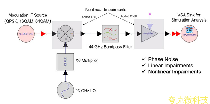 在中頻(IF)和次THz頻率之間進行上變頻和下變頻涉及使用本地振蕩器(LO)信號源和變頻器進行頻率轉換。爲瞭避免影響信號調製特性,經常在LO路徑而不是信號路徑中使用的倍頻器會增加相位噪聲。乘法器還可能引入相加的相位噪聲,這將進一步降低相乘的LO相位噪聲。在亞太赫茲頻率下,低殘留EVM測試繫統性能需要高質量,低相位噪聲的LO信號源。