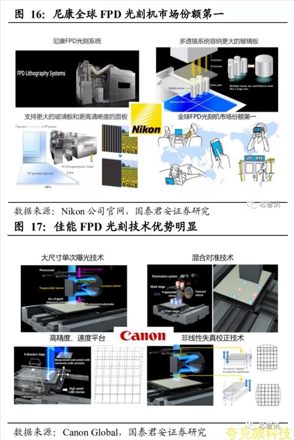 尼康、佳能 FPD 光刻技術優勢明顯,基本壟斷瞭 FPD 光刻機市場,其中尼康份額最高。自 1986 年尼康在 FPD 製造領域推齣 NSR-L7501G 以來,尼康開髮併銷售瞭大量的 FPD 光刻繫統,尼康不僅是大型 FPDs 光刻繫統的領導者,而且還爲智能手機和麵闆電腦生産中小型高清 FPDs提供理想的型號。