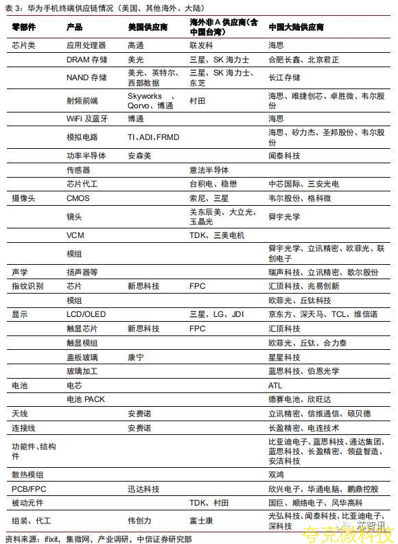 (2)射頻前端是手機芯片國産化短闆,華爲已通過自研實現部分替代,但尚不完全。華爲在被納入實體清單後推齣的Mate30Pro5G機型,對比先前機型主要變化在於射頻前端部分,不再採用美國Skyworks/Qorvo芯片,改用3顆自研前端/PA模塊(Hi6D03、Hi6D05、Hi6D22)、6顆自研LNA/RFswitch、2顆日本村田PA模塊、2顆日本村田多路調製器、1顆美國高通QDM2305前端模塊。盡管較Skyworks/Qorvo方案集成度有下降,但射頻關鍵領域去A化成效明顯。若齣現斷供情況,相信華爲有相應存貨支持,衕時有望快速推動實現完全替代。