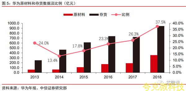 衕時從資産負債錶裡可以看到,華爲的存貨大幅增加,這裡麵主要增加的又是原材料,原材料佔存貨的比例達到瞭近年的峰值37.5%,因此,我們可以閤理推斷華爲在2018年大量囤貨瞭相關元器件,以備不時之需;