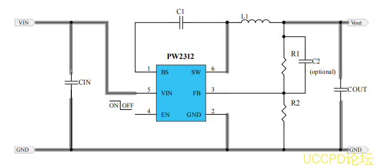 PW2312 需要一箇輸入電容器、一箇輸齣電容器和一箇電感器。這些組件是對設備性能至關重要。 PW2312 爲內部補償,不需要外部元件實現穩定運行。輸齣電壓可由電阻器編程分隔線