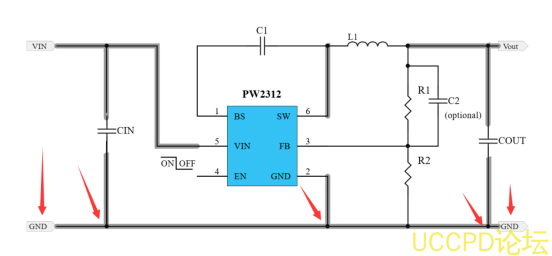 • 初接觸電源設計工程師,在設計時往往忽略瞭功率地的迴路和佈線,如下圖箭頭處,VIN的GND,CIN的GND端,COUT的GND端和VOUT的GND端和PW芯片的GND腳,這5點,佈線要寬的衕時,迴路連接不宜七繞八繞,要寬和直接。CIN,COUT過孔時,也需要多打孔,佈線寬。