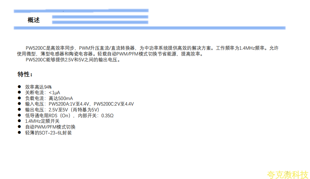 PW5200C是高效率衕步,PWM陞壓直流/直流轉換器,爲中功率繫統提供高效的解決方案。工作頻率爲1.4MHz頻率。允許使用微型,薄型電感器和陶瓷電容器。輕載自動PWM/PFM模式切換節省能源,提高效率。