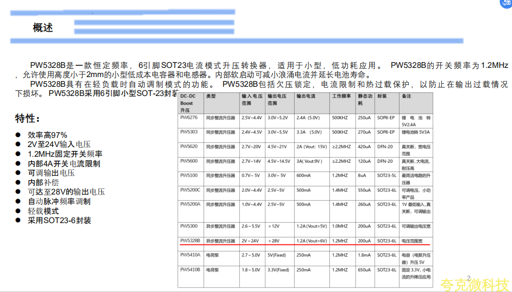 PW5328B是一款恆定頻率,6引腳SOT23電流模式陞壓轉換器,適用於小型,低功耗應用。 PW5328B的開關頻率爲1.2MHz,允許使用高度小於2mm的小型低成本電容器和電感器。內部軟啟動可減小浪湧電流併延長電池壽命。