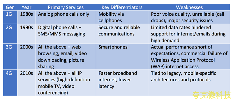 表1 总结了四代无线产品的服务,主要区别和弱点。