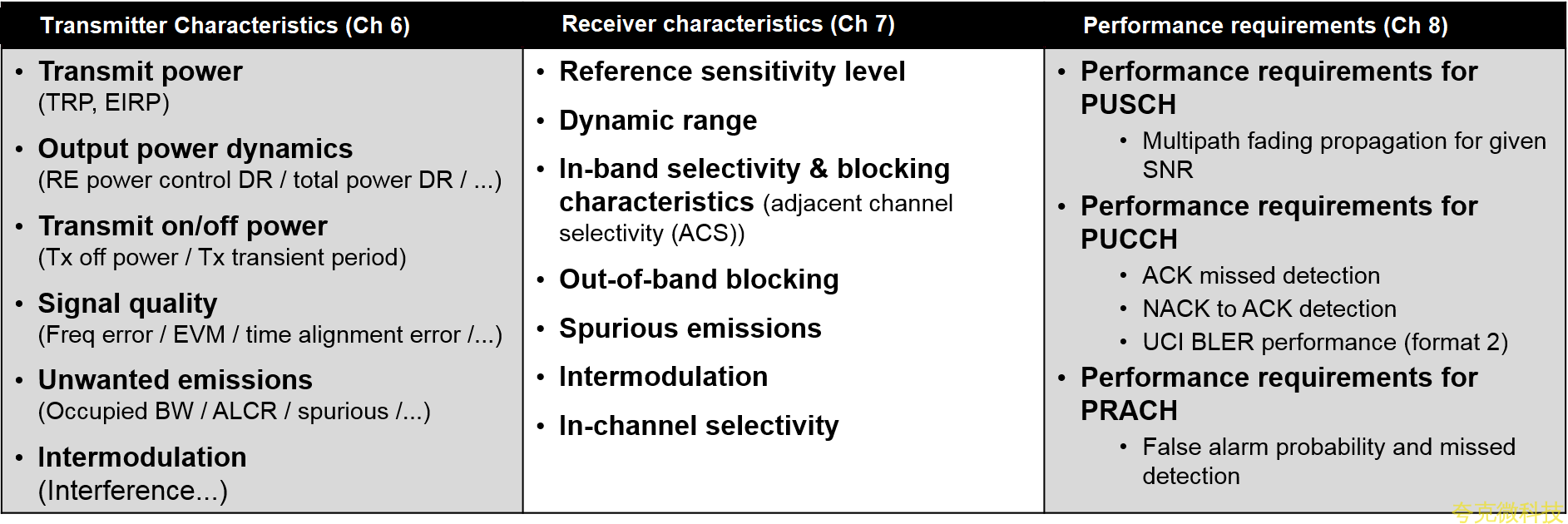 包括发射机特性,例如发射功率,信号质量和频谱发射,以确保设备产生足够的功率,成为一个良好的邻居并提供良好的传输链路。