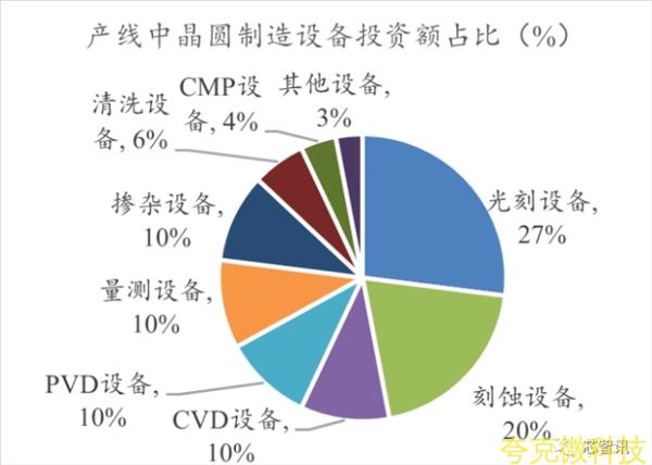 IC 前道光刻机技术最为复杂,光刻工艺是 IC 制造的核心环节也是占用时间比最大的步骤,光刻机是目前晶圆制造产线中成本最高的半导体设备。根据格罗方德的数据显示,光刻设备约占晶圆生产线设备成本 27%,光刻工艺占芯片制造时间 40%-50%。