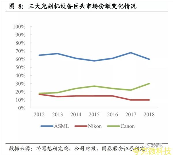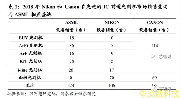 数据显示,2018年,Canon 和 Nikon 在 EUV、ArFi、ArF 机型销售量远低于 ASML,二者产品主要集中价值量更低的后道光刻机以及面板光刻机领域。
