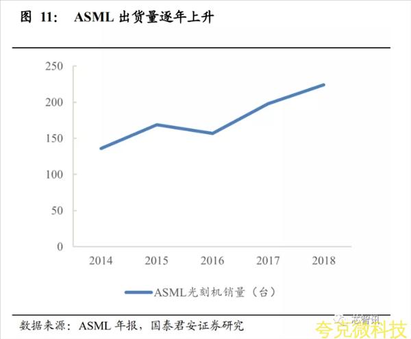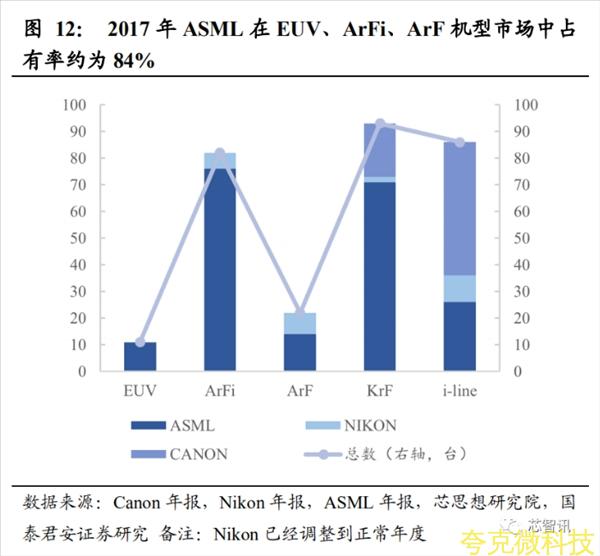 ASML 在技术更先进的 EUV、ArFi、ArF 机型市场占有率不断提升,且远大于 Canon 和 Nikon。2017 年 ASML 上述三种机型出货量总计为101 台,市场份额占比为 78.29%,到 2018 年 ASML 出货量增长到 120台,市场份额约 90% 。