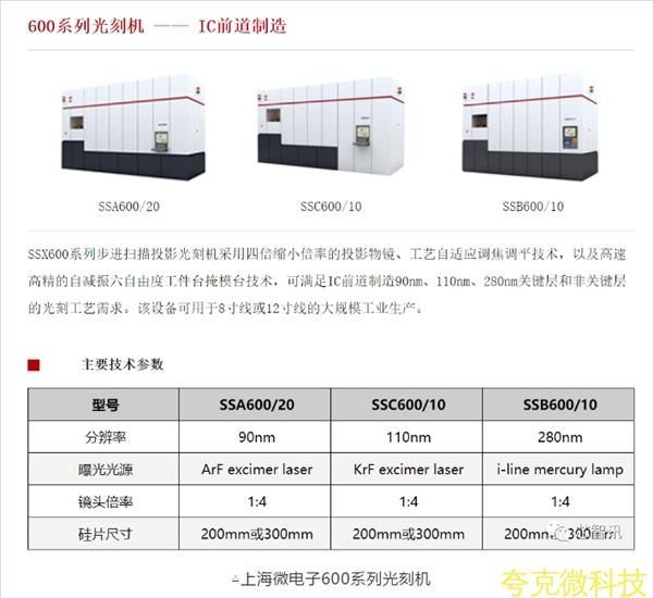 其中,SSX600 系列步进扫描投影光刻机采用四倍缩小倍率的投影物镜、工艺自适应调焦调平技术,以及高速高精的自减振六自由度工件台掩模台技术,可满足 IC 前道制造 90nm、110nm、280nm 关键层和非关键层的光刻工艺需求,该设备可用于 8吋线或 12 吋线的大规模工业生产。