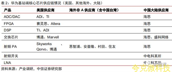 我们将产品里不含美国元器件称之为去A,华为运营商BG除了个别老产品,已经实现了全系列产去A。基站最核心的芯片包括ADC/DAC芯片、FPGA、DSP、交换芯片、射频PA、LNA、PA驱动等。