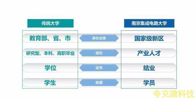 一般而言,传统大学的承办主体是 教育部、省或者市,定位为研究型学员、本科或者高职,学生毕业之后会被授予学位证,而南京集成电路大学的承办主体则是国家级新区,即南京江北新区,旨在培养产业人才,就读南京集成电路大学的成员,统称为“学员”,并在完成学习之后获得结业证书。
