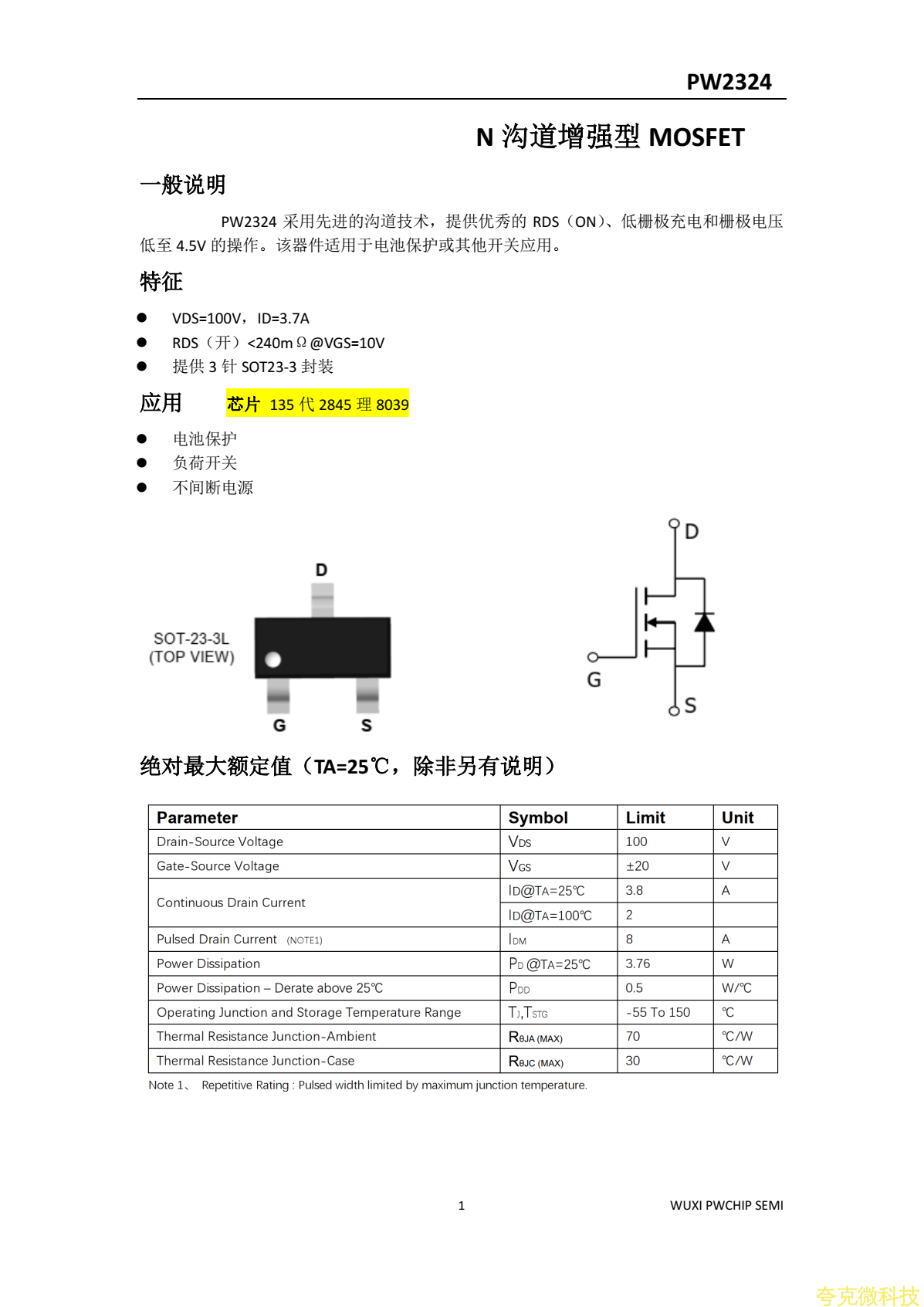 PW2324平芯微PW规格书,100V,4A的NMOS管