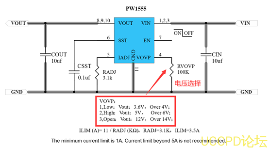 PW1555可选三个输入电压挡位:3.6V,5V,12V(9-13V范围),由4脚选择