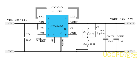 1-2:PW2228A 和PW2224 ,输入电压1.8V-5V 之间,宽于并可满足3V-4.2V 的输入电压,可以调节输出电压2.8V-5V 的范围之间。PW2228A 是1.5A 最大规格,PW2224 是3A最大规格。
